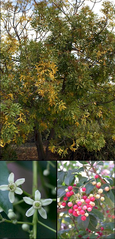 Descripción: Árbol siempreverde o semicaducifolio, dioico, de 7-10(-20) m de altura, con una copa redondeada o extendida, con ramas fuertes; , ramillas delgadas, lisas, con marcas de las hojas y abundantes lenticelas blanquecinas. Tronco grueso, que con los años puede formar contrafuertes en la base. Corteza de color gris claro o marrón muy oscuro, lisa al principio, tornándose áspera y descamándose con los años. Hojas alternas y agrupadas hacia el final de las ramillas, imparipinnadas, de 35-50 cm de largo incluido el pecíolo, con el raquis achatado y con una línea rojiza central y 3-6(-8) pares de folíolos opuestos o subopuestos, de lanceolados a oblongos, de 14 x 6 cm, con la base cuneada y asimétrica, el margen entero con un borde rosado o rojizo, y el ápice acuminado. Son de textura delgada, generalmente glabros, más raramente pubescentes, de color verde oscuro brillante, tornándose rojizos o amarillos con el frío. Nervadura con el nervio central destacado, amarillento o rojizo, y nervios secundarios poco aparentes. Pecíolo engrosado en la base, de 5-7 cm de largo; peciólulos de 0-5 mm de largo. Flores muy pequeñas, de 5-6 mm de diámetro, blancas o verdosas, a veces con tintes rosados, olorosas, actinomorfas, unisexuales, dispuestas en panículas laxas de 10-17 cm de largo que aparecen bajo las hojas, en la madera del año. Cáliz pubérulo, de 2-3 mm de largo, con 5 sépalos unidos en la base; corola con 5 pétalos elíptico-oblongos, imbricados, de 4-5 mm de largo, pubérulos. Androceo con 10 estambres unidos formando un tubo de 2-3 mm de longitud. Gineceo con un ovario súpero, sésil, setuloso, con 2 óvulos en cada lóculo; estilo corto y grueso, de 1 mm de largo; estigma con 4-5 lóbulos. Frutos en drupas carnosas esféricas, de 1,5 cm de diámetro, verdes al principio, pasando al rosa y al rojo cuando maduran. Contienen 2-4 pirenos. El árbol produce muchas flores y frutos cuando dispone del agua suficiente. Cultivo y usos: Árbol sensible al frío si es intenso, pudiendo perder el follaje, que prefiere suelos bien drenados y que gusta disponer del agua suficiente, por lo que los riegos no deben descuidarse si queremos que florezca y fructifique. Se multiplica por semillas frescas con facilidad y también es posible por esquejes, teniendo un crecimiento muy rápido. Su madera es susceptible al ataque de insectos, utilizándose en la fabricación de muebles y paneles y la construcción de barcos. Las hojas proporcionan forraje y los frutos son al parecer comestibles. La corteza contiene taninos y tiene usos medicinales. Su sistema radicular no es agresivo y puede ser un buen árbol de sombra, incluso en zonas costeras. |