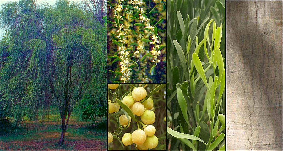Descripción: Arbusto o arbolito siempreverde, aunque bajo condiciones de sequía se comporta como semicaducifolio, espinoso, de 4-6 m de altura, con uno o varios troncos y una copa redondeada con numerosas ramas ascendentes, con las ramillas colgantes, cubiertas de diminuta pubescencia blanquecina. Espinas solitarias, axilares, rectas o recurvadas, a veces ausentes en las ramas más viejas, de hasta 2,5-3,5 cm de largo en ejemplares jóvenes. Hojas simples, alternas, de linear-oblongas a cuneiformes, de 2,5-4 x 0,4-1 cm, con la base estrechándose en un corto pecíolo, el margen normalmente entero y el ápice redondeado y con frecuencia emarginado; son de textura gruesa y coriácea, de color glauco o verde grisáceo, con pelos adpresos grises en ambas superficies y con la nerviación poco marcada. Flores solitarias o en pequeños racimos axilares de 2-3, blancas, de 8-10 mm de diámetro, sobre delgados pedicelos de 4-6 mm de largo. Cáliz con 3-5 sépalos anchos; corola con 3-5 pétalos oblongos, estrechados en la base; androceo con (3-)4 veces el número de estambres que de pétalos, con filamentos delgados, libres, de 4-5 mm de longitud. Pistilo con un ovario ovado, de 3-4 mm de largo, con 3-5 lóculos y 2 óvulos en cada lóculo; estilo corto. Fruto en baya subglobosa u obovoide, de 7-12 x 8-10 mm, lisa, de color amarillo, con una pulpa ácida amarillo-verdosa, conteniendo 2-4 semillas ovales de 5-6 x 3-4 mm, monoembriónicas. Cultivo y usos: Especie muy apropiada para climas secos, pudiendo vivir en condiciones desérticas y soportar suelos áridos y arcillosos. Es bastante rústica y resiste hasta heladas moderadas. En sequías prolongadas se desprende de las hojas, y las ramillas verdes asumen parcialmente la función clorofílica. La propagación puede realizarse por medio de semillas o por esquejes de madera semimadura. Se hibrida con facilidad con otras especies de Citrus, produciendo tanto híbridos bigenéricos como trigenéricos. La lima del desierto es muy apreciada por los aborígenes y forma parte destacada de los alimentos que les permiten sobrevivir en el semidesierto australiano. Sus frutos tienen un sabor parecido a la lima, y se utilizan en la preparación de bebidas refrescantes y en la elaboración de salsas y mermeladas. La especie es potencialmente importante en los programas de mejora genética de cítricos por su extremada resistencia a la sequía y su poca exigencia en cuanto a suelos, siendo el único cítrico adaptado a las condiciones xerófilas. |