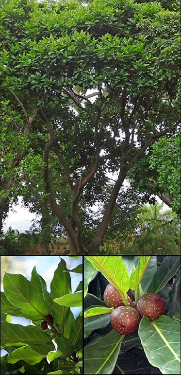 Descripción: Árbol siempreverde, laticífero, de 6-10 m de altura en cultivo, con la corteza grisácea y bastante lisa y las ramillas glabras o pubérulas, con pelos marrones. Estípulas triangulares, libres, de 7-11 x 3-3,5 mm, de color rojo oscuro externamente, glabras o algo pubérulas al principio, pronto caedizas. Hojas dispuestas en espiral hacia el final de las ramillas, con la lámina oblongo-lanceolada, a veces algo panduriforme, de (15-) 25-60 x 6-20 (-25) cm, con la base redondeada, cordada o atenuada y con 2 pequeños lóbulos, el margen entero, a veces algo ondulado, y el ápice obtusamente acuminado; son de textura coriácea, de color verde brillante por el haz y más claras por el envés, glabras en ambas superficies; nerviación con el nervio central marcado por el haz y muy prominente, y a veces rojizo, por el envés, con 6-10 (-14) pares de nervios laterales algo arqueados, más destacados por el envés que por el haz. Pecíolo de unos 2,5-8 cm de longitud y 4-10 mm de grosor, glabro. Siconos sésiles, axilares, solitarios o con mayor frecuencia dispuestos en pares, con el receptáculo subgloboso, ligeramente hispídulo o estriguloso, de unos 3-4(-5) cm de diámetro, de color verde oscuro, tornándose rojizo con puntos blancos en la madurez, rugoso y tuberculado al secarse; el ostíolo es pequeño y poriforme, poco elevado, sin brácteas externas. Brácteas basales 2, triangular-ovadas, obtusas, de 5-18 x 3-14 mm, pubescentes externamente, persistentes. Flores masculinas poco numerosas. Cultivo y usos: Especie que requiere de climas templados, no tolerando las heladas. Gusta de suelos bien drenados, de una exposición luminosa y algo soleada, soportando bien la sombra, y de humedad ambiental elevada. Se multiplica por semillas y por esquejes, y probablemente también por acodos aéreos. Es un árbol que quizás podría comercializarse también como planta de interior por el interés y tamaño de sus hojas. Es polinizado por el himenóptero Agaonidae Agaon gabonense Wiebes, cuya presencia en España no está citada, por lo que los frutos permanecen sin polinizar. Localmente de la corteza se han obtenido fibras para confeccionar paños y vestidos, y su látex mezclado con miel tiene algunas aplicaciones medicinales para dolencias cardíacas. |