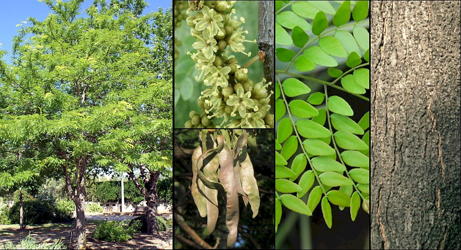 Descripción: Árbol caducifolio de 8-10 m de altura, muy espinoso, con la copa más o menos esférica o abovedada y el tronco más bien corto, con la corteza marrón-grisácea, formando placas alargadas que se agrietan profundamente con la edad. Espinas rectas y rígidas, de color marrón oscuro o casi negras, de sección aplanada o comprimida, generalmente ramificadas, pudiendo alcanzar las del tronco 15(-20) cm de longitud. Hojas pinnadas, o bipinnadas y con 6-8 pares de pinnas, ambos tipos sobre el mismo árbol, con el raquis puberulento y acanalado, portando de 6 a 10 pares de folíolos sésiles o subsésiles, de oval-elípticos a lanceolados, de 2,5-5 x 1,5-1,9 cm, con la base redondeada, el margen entero o ligeramente crenado y el ápice acuminado, redondeado y a veces emarginado. Son de textura papirácea, de color verde brillante o verde medio, tornándose amarillos en el otoño antes de caer, con el nervio medio puberulento en ambas caras. Inflorescencias en racimos axilares, pubescentes, de 5-10 cm de longitud, más cortos que las hojas, portando pequeñas flores actinomorfas, funcionalmente unisexuales (polígamas), blanco-verdosas o verde-amarillentas, sobre cortísimos pedicelos, con 4 sépalos triangular-lanceolados y 4 pétalos oblongos, ambos pubescentes y muy parecidos. Androceo con 8 estambres libres, con filamentos cilíndricos, exertos. Gineceo con ovario estipitado, puberulento, con numerosos óvulos; estilo muy corto, con estigma discoideo y más o menos lobulado. Legumbres delgadas y aplanadas, subcoriáceas, indehiscentes, de 22-30 x 2,5-3 cm, con una pulpa dulzona, rectas o falcadas, de color marrón oscuro, lisas y ligeramente pubescentes. Contienen numerosas semillas ovaladas, comprimidas, de aproximadamente 8-10 mm de largo, de color marrón oscuro brillante, que se alojan cerca de la sutura superior del fruto. Cultivo