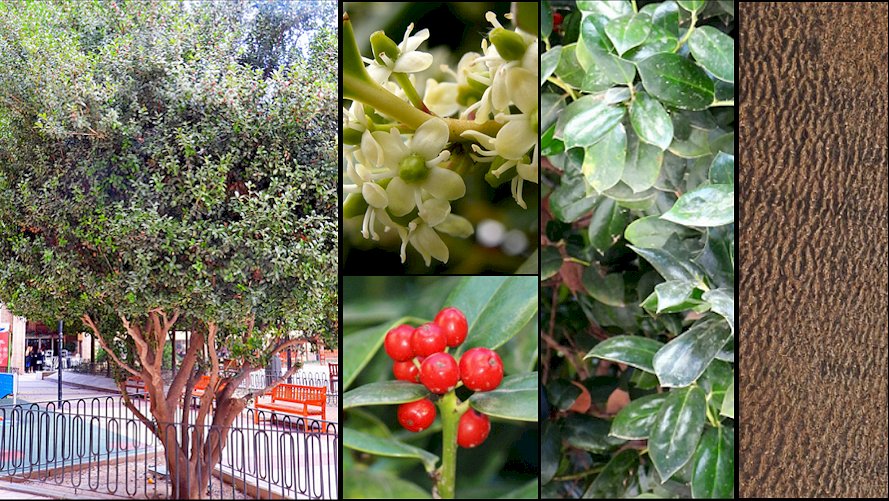 Descripción: Arbusto o arbolito siempreverde, dioico, de 2,5-4 m de altura, con una copa densa y redondeada y normalmente varios troncos con la corteza lisa, de color pardo-verdosa o verde-grisácea, tornándose escamosa con el paso de los años; ramillas jóvenes angulosas y sulcadas longitudinalmente, pulverulentas o glabrescentes, pasando a subredondeadas con los años. Las ramillas verdes adquieren tonalidades rojizas con los fríos invernales. Hojas simples, alternas, cuadrangular-oblongas u ovadas, de 4-10 x 2-5 cm, con la base redondeada o subtruncada, el margen con 1-2(-3) espinas a cada lado, una en cada esquina en las hojas cuadrangulares, o a veces entero, y el ápice con una fuerte espina recurvada, son de textura coriácea, glabras, de color verde oscuro brillante por el haz y más claras por el envés, con la nervadura impresa y poco evidente por el haz y ligeramente más marcada por el envés, con 4-6 pares de nervios secundarios laterales que se anastomosan cerca del margen. Pecíolo de 4-6 mm de largo, sulcado y puberulento. Inflorescencias en fascículos axilares sobre la madera vieja, con brácteas anchamente deltoides y pedicelos glabros de 5-9 mm de largo. Cáliz discoide, de 2,5 mm de diámetro, con 4 lóbulos deltoides, membranáceos, ciliados; corola rotácea, de unos 7 mm de diámetro, con 4 pétalos blanquecinos, oblongo-ovados, de 3-4 mm de largo. Flores masculinas con estambres tan largos como los pétalos y un ovario rudimentario subgloboso; flores femeninas con estaminodios más cortos que los pétalos y un ovario oblongo-ovoide, de 3-4 x 2 mm; estigma discoide, con 4 lóbulos. Frutos drupáceos, globosos, rojos, de 8-10 mm de diámetro, acompañados del cáliz y el estigma discoide persistentes, sobre pedicelos de 8-15 mm de longitud, conteniendo 4 pirenos obovoides o elipsoides, de 7-8 x 5 mm, rugosos y con el endocarpo óseo. Cultivo y usos: Planta de climas templados que soporta bien el frío y las heladas, admitiendo bastante tipos de suelos, siempre que drenen bien y que sean algo ácidos o neutros. En verano hay que aportarle algunos riegos, siendo tolerante con la sequía una vez establecido. Se multiplica por semillas y por esquejes, siendo su crecimiento algo lento. Tolera las exposiciones soleadas y crece bien con semisombra, y no soporta bien los trasplantes, aunque si el aire de nuestras ciudades. Admite perfectamente las podas y recortes, utilizándose como seto impenetrable por sus hojas espinosas. Sus frutos son tóxicos, lo que debe tenerse en cuenta. Existen híbridos con I. aquifolium y con I. pernyi, y cultivares tales como ‘Burfordii’, ‘Dazzler’, ‘Crimson Fire’, ‘Rotunda’, ‘Carissa’. |