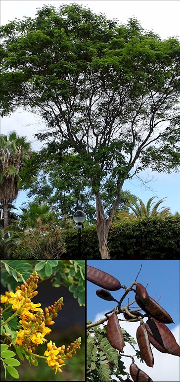 Descripción: Árbol semicaducifolio de 7-15(-30) m de altura, con una copa densa, abierta y algo aparasolada, y un tronco recto y grueso, con la corteza lisa y grisácea, que se pela y desprende en placas dejando ver debajo una corteza verdosa. Ramillas más o menos pubérulas o glabras. Hojas alternas, bipinnadas, de hasta 20 cm de largo, con 6-13 pinnas opuestas o subopuestas, de 7-8 cm de largo, cada una con 4-15 pares de folíolos opuestos, de estrechamente elípticos a elíptico-obovados, de 3,2 x 1,4 cm, con la base simétrica, redondeada o ligeramente cordada, el margen entero y revoluto y el ápice retuso o redondeado. Son de textura cartácea, glabros o pubérulos, con la nervadura secundaria más apreciable por el envés. Inflorescencias en panículas terminales de 8-10 cm de largo, glabras, con brácteas ovadas, agudas, de 1,5-3 x 0,8-2 mm, pubescentes externamente. Flores bisexuales, zigomorfas, de 1 cm de diámetro, sobre pedicelos de 5-10 mm de largo, articulados bajo el hipanto. Cáliz con 5 sépalos oblongos, de 7 x 4 mm, glabros, ciliados en el margen. Corola con 5 pétalos libres, de color amarillo dorado, con el estandarte de 8 x 7 mm manchado de rojo-anaranjado, las alas de 5-8 x 3-5 mm y la quilla de 6 x 4 mm. Androceo con 10 estambres libres, con los filamentos de 7-10 mm de largo, pubescentes en la mitad inferior, y las anteras glabras. Ovario ínfero, velutinoso, de 5 x 1,3 mm; estilo de 7 mm de largo, pubescente salvo en el ápice; estigma ciliado. Legumbre indehiscente, oblonga, comprimida, de 8-10 x 2-4 cm, apiculada, leñosa, lisa, glabra, tornándose marrón-negruzca en la madurez. Semillas duras, elípticas, lisas, glabras, de 10 x 6 mm. Cultivo y usos: Gusta de climas suaves, libres de heladas, y de suelos bien drenados y sueltos, bajo una exposición soleada y con disponibilidad de riegos. Su sistema radicular es algo agresivo, un aspecto a tener en cuenta a la hora de su ubicación. Se debe evitar plantarlo en zonas ventosas por sus ramas quebradizas. Su madera es dura, pesada y muy durable, utilizándose en construcción civil y naval, fabricación de muebles, etc. Tiene algunas aplicaciones medicinales contra anemias, contusiones, diabetes e infecciones pulmonares. Se multiplica por semillas, que deben ser escarificadas antes de su siembra. Generalmente se cultiva con fines ornamentales como árbol de sombra la var. leiostachya (Benth.) L.P. Queiroz = Caesalpinia leiostachya (Benth.) Ducke. |