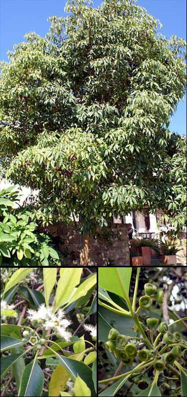 Descripción: Árbol siempreverde de 30-40 m de altura en su lugar de origen, aunque los ejemplares cultivados no suelen sobrepasar de 10-12 m, con una copa densa, redondeada o piramidal, de color verde intenso, y un tronco recto con la corteza algo variable, normalmente de color gris claro o castaño, escamosa y persistente en la parte basal, y castaño o verdosa en la parte superior del tronco y en las ramas, desprendiéndose y dejando a la vista una superficie lisa, marrón-rojiza o rosa-anaranjada con manchas verticales cremosas. Ramillas jóvenes generalmente cubiertas de pelos sedosos y desprendiendo un jugo lechoso al romperse. Yemas protegidas por escamas imbricadas, coloreadas, de 6-18 mm de largo. Hojas adultas alternas, aunque agrupadas muy juntas hacia el final de las ramillas aparentando ser verticiladas, de ovadas a elípticas, de 8-15 x 4-4,5 cm, con la base cuneada, el margen entero, a veces algo ondulado, y el ápice agudo; son de textura gruesa, de color verde oscuro brillante por el haz y más claras por el envés, con el nervio central bien visible, amarillento, y numerosos nervios secundarios laterales muy finos. Pecíolo de 2-2,5 cm de largo. Las hojas juveniles son opuestas, cortamente pecioladas, más pequeñas, con pelos finos por el envés. Inflorescencias en cimas axilares de 3-7 flores sobre un pedúnculo aplanado de 13-25 mm, situadas por debajo de las hojas. Flores de 2-3 cm de diámetro, cortamente pediceladas. Cáliz acampanado, de 5-10 mm de longitud, finamente peloso, con 5 lóbulos cortos, obtusos, de 2-2,5 mm de largo, caedizos. Corola con 5 pétalos ovados o redondeados, blancos, de 10-15 mm de longitud, con el margen ondulado. Androceo con los estambres formando 5 manojos opuestos a los pétalos, blancos, de 15-20 mm de largo, con más de 70 filamentos cortos a lo largo de toda la longitud del manojo, con las anteras muy pequeñas. Ovario ínfero, trilocular, ocupando totalmente la parte inferior del cáliz, con un estilo recto y delgado de hasta 5 mm de longitud. Fruto en cápsula leñosa, cortamente pedicelada, acampanada, truncada, lisa, verdosa, de 8-10 x 7-10 mm, abriéndose en la cúspide por 3 valvas. Contiene numerosas semillas lineares, de color marrón claro, de 2-3 mm de largo. Cultivo y usos: Árbol bastante tolerante con casi todo tipos de suelos, aunque prefiere los ligeramente ácidos y bien drenados, que gusta de situaciones soleadas o a media sombra, no soportando las heladas, especialmente los árboles jóvenes. Requiere de riegos los primeros años, pero una vez establecido soporta las sequías. Tolera bastante bien la polución y el trasplante, siendo interesante como árbol urbano de alineación. Necesita algunas podas iniciales de formación. Existe el cultivar ‘Variegata’, con los bordes de las hojas amarillos. Se multiplica con facilidad por semillas. Su madera tiene varias aplicaciones. |