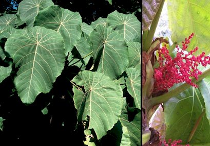 dehiscente en 2 mericarpos bivalvos, con 2 picos o espinas en el ápice de cada valva. Cultivo y usos: Planta tropical que sólo puede cultivarse en lugares libres de frío, en situaciones protegidas. Se multiplica por semillas. Es interesante por sus grandes hojas y sus inflorescencias de color coral. |