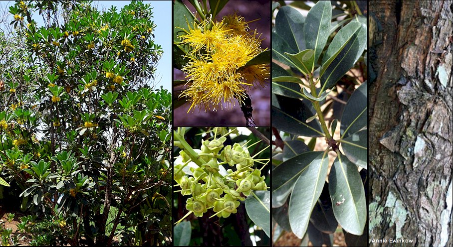 Descripción: Arbusto o arbolito siempreverde de 5-8 m de altura, alcanzando mayor porte en los bosques de su zona de origen, con una copa más o menos piramidal o algo redondeada y un tronco cilíndrico con la corteza gris-rojiza, que con los años se va tornando áspera y muy escamosa; ramas de los individuos jóvenes angulosas, a veces hasta aladas, glabras o pubescentes, con las hojas generalmente mucho mayores que las de los adultos; yemas con escamas ovadas, glabras, de 15 x 10 mm. Hojas agrupadas hacia el extremo de las ramas, dispuestas normalmente en verticilos de 3, con la lámina de oblanceolada a obovada, de 8-16,5 x 2,5-6,2 cm, la base atenuada o cuneada, el margen entero y el ápice obtuso o redondeado; son de textura coriácea, inicialmente con pelos plateados, luego glabras, de color verde oscuro brillante por el haz y ligeramente más claras por el envés, rojizas cuando jóvenes; nervadura poco resaltada, salvo el nervio medio, que es amarillento, con numerosos nervios secundarios laterales, paralelos y muy finos; pecíolo glabro, amarillento, de 1-3 cm de largo. Inflorescencias terminales, por debajo de las hojas, compuestas de grupos de 2-3 flores sobre un pedúnculo de 1-2 cm de longitud, acompañadas de brácteas y bractéolas de lineares a lanceoladas, de 14 x 4 mm. Pedúnculos, pedicelos, brácteas, bractéolas, hipanto y sépalos glabros o con pelos plateados. Flores cortamente pediceladas, con un hipanto obcónico de 3-8 x 10-12 mm, algo acrescente en la fructificación; cáliz con 5 sépalos redondeados, de 5-8 x 6-11 mm; corola con 5 pétalos fimbriados, amarillos, de 7,5-10 x 6-8 mm. Androceo con 50-100 estambres libres, dispuestos en 2-3 series, con los filamentos amarillos, los externos de 20-35 mm de largo y los internos algo más cortos, con anteras amarillas de 1,2-1,6 mm. Ovario ínfero, glabro o pubescente, trilocular, con numerosos óvulos; estilo amarillo, de 25-30 mm de largo, con un pequeño estigma convexo. Frutos con el hipanto obcónico de 5-8 mm de alto y 8-12 mm de diámetro, de color marrón en la madurez, abriéndose por 3 valvas. Semillas aladas, de 2,5-3 x 0,7-1 mm. Cultivo y usos: Planta que requiere de climas suaves, aunque de adulta puede aguantar hasta 0 grados por un corto periodo de tiempo, de suelos de tipo medio, bien drenados, con pH = 6,5, con una exposición semisombreada de joven y más soleada de adulta, con aporte de riegos periódicos. Al parecer crece mejor si se estimula su cultivo con las micorrizas adecuadas. Se multiplica con facilidad por semillas, que a temperatura ambiente permanecen viables por varios meses, no necesitando tratamientos de presiembra. También puede multiplicarse por esquejes apicales. Su crecimiento es más bien lento. Al parecer su madera es bastante resistente al ataque de hongos. |