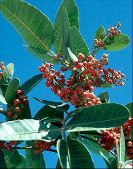 Descripción: Arbusto o arbolito dioico, caducifolio, de hasta 6-8 m de altura, pudiendo llegar a más con los años, con la corteza que se torna agrietada y escamosa con los años. Hojas alternas, imparipinnadas, con folíolos de ovados a oblongos, algo coriáceos. Flores en racimos, rojizas, carentes de pétalos. Las masculinas con 5 estambres. Fruto en pequeña drupa ovoide de color rojo intenso. Cultivo y usos: Se multiplica por semillas y por esquejes. Requiere exposición soleada y suelos de tipo medio, tolerando los calizos. |