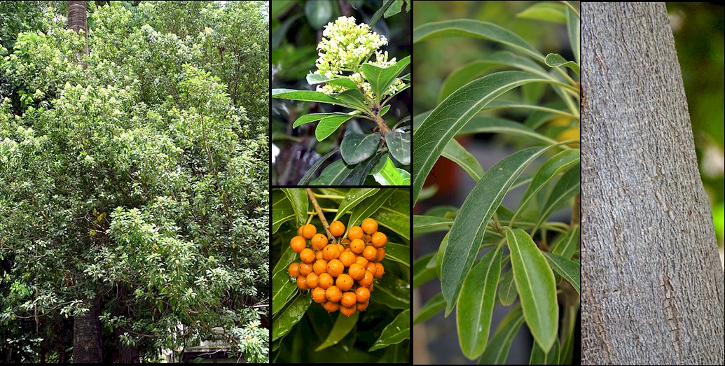 Descripción: Arbolito siempreverde de 3-10 m de altura en cultivo, con una copa más o menos globosa y un tronco delgado con la corteza lisa, castaño-verdosa, que se torna rugosa y escamosa con los años; ramillas con pubescencia ferrugínea cuando jóvenes y más tarde glabras y algo lenticeladas. Hojas dispuestas en espiral o en pseudoverticilos hacia el final de las ramas, de estrechamente elípticas a oblanceoladas, de 4-12 x 1-3,5 cm, con la base estrechamente cuneada y decurrente, el margen entero y a veces algo ondulado y el ápice agudo o raramente redondeado, ligeramente acuminado. Son de textura algo gruesa cuando adultas, de color verde oscuro brillante por el haz y más claras por el envés, cuando jóvenes algo pubescentes y más tarde glabras por ambas caras; nervadura con el nervio medio destacado, especialmente por el envés, con 7-10 pares de nervios secundarios poco resaltados y pronto anastomosados, formando una retícula muy fina. Pecíolo glabro, de 5-10(-15) mm de largo. Inflorescencias en panículas terminales piramidales de hasta 8 cm de largo, sobre pedúnculos pubescentes de 2-4 cm de largo, con el raquis y las ramificaciones igualmente pubescentes, con brácteas de estrechamente ovadas a lanceoladas, ciliadas en el margen, caedizas. Flores funcionalmente unisexuales, de unos 5 mm de diámetro, sobre pedicelos de 3-6 mm de largo. Cáliz con 5 sépalos libres o ligeramente connados en la base, de ovados a oblongos, glabros, de ápice obtuso, de 1-2 x 0,6-1 mm; corola con 5 pétalos oblongo-lineares, de 6-8 x 1 mm, blancos, glabros. Estambres 5, con los filamentos de 4-5 mm de largo y las anteras oblongas en las flores masculinas, siendo más cortos y con las anteras sagitiformes en las femeninas. Ovario estipitado, ovoide, bilocular, glabro, más desarrollado en las flores femeninas que en las masculinas, conteniendo 6-8 óvulos en cada lóculo; estilo glabro, de 2-2,5 mm; estigma no engrosado en las flores masculinas. Fruto en cápsula globosa y algo comprimida, apiculada, de 6-9 mm de diámetro, al principio verdosa y anaranjada en la madurez, glabra, dehiscente por dos valvas delgadas, rugosas, dejando ver 6-8(-10) semillas algo irregulares, rojizas, de unos 3 x 2 mm. Cultivo y usos: Requiere ser cultivado en zonas libres de heladas, en suelos con algo de humedad y fértiles, pero bien drenados, en una exposición soleada o con media sombra. Se multiplica por semillas y por esquejes, siendo su crecimiento relativamente rápido. De sus frutos se obtiene por destilación un aceite de olor agradable, llamado aceite de mamalis. La corteza se utiliza localmente como febrífugo y contra la bronquitis. |