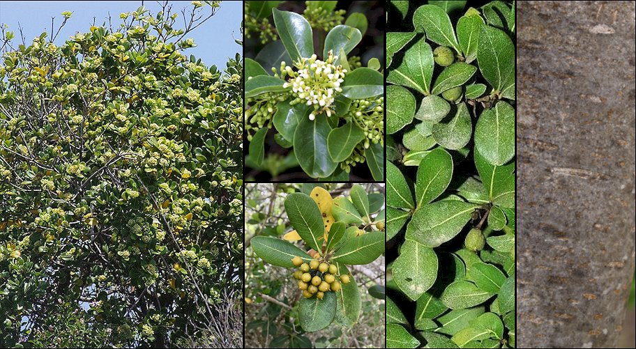 Descripción: Árbol o arbusto siempreverde, semicaducifolio según las condiciones, de 7-8 m de altura, con una copa normalmente densa y extendida y un tronco con la corteza gris oscura, lisa de joven y generalmente con bandas horizontales de lenticelas, tornándose rugosa con el tiempo. Hojas simples, alternas, agrupadas hacia el final de las ramas, espatuladas, obovadas o anchamente oblanceoladas, de 11 x 4 cm, con la base estrechándose en el pecíolo, el margen entero y a menudo ondulado y el ápice redondeado o ligeramente atenuado, pero a menudo algunas de las hojas son deformes. Tienen una textura membranácea o subcoriácea, y son glabras, de color verde fuerte o verde azulado por el haz, y más claras por el envés. Al estrujarlas despiden olor resinoso. Nervadura central plana o ligeramente impresa en el haz y prominente en el envés, con hasta 8 pares de nervios laterales, finos, que se fusionan en una reticula densa y uniforme que es muy visible por el haz. Pecíolo de unos 2 cm de largo. Flores pequeñas, actinomorfas, bisexuales pero funcionalmente unisexuales, de color blanco-verdoso o crema, perfumadas, dispuestas en panículas terminales subumbeliformes, sobre pedicelos de 3-10 mm de longitud. Cáliz glabro o algo pubérulo, con 5 sépalos de lanceolados a linear-lanceolados, de 2-3 mm de largo, libres o connados. Corola de 5 pétalos recurvados, imbricados, al menos en la yema, de 5-8 x 1,5-3 mm. En las flores funcionalmente masculinas hay 5 estambres libres, alternando con los pétalos, con filamentos de 4-6 mm de largo y anteras de ovadas a oblongas de 1,2-2,2 mm. En las funcionalmente femeninas hay un pistilo con ovario súpero, bicarpelar, glabro o pubescente, de 4-6 mm de largo, con estilo simple y corto y estigma igualmente simple. Cápsulas agrupadas hacia el final de las ramas, coriáceas, casi esféricas, de 8-10 mm de diámetro, con 2 valvas, inicialmente verdes tornándose luego amarillentas o de color marrón claro. Al abrir muestran 4 semillas brillantes de color rojo anaranjado en cada valva, cubiertas de una resina pegajosa de agradable olor. Cultivo y usos: Árbol poco exigente e interesante desde el punto de vista ornamental cuando se llena de frutos, con un sistema radicular poco agresivo, pudiendo utilizarse en aceras, resistente a heladas cortas y ligeras y bastante tolerante con la sequía, que requiere suelos bien drenados, de ligeramente ácidos a neutros. Se multiplica con facilidad por semillas. |