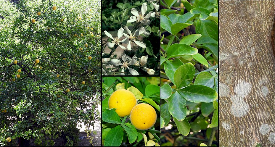 Descripción: Arbusto o arbolito caducifolio de 3-5 m de altura, con una copa muy ramificada y uno o varios troncos con la corteza lisa de color castaño con finas líneas blanquecinas longitudinales; ramaje abundante, con las ramillas verdes, rígidas, angulosas y con fuertes espinas de 4-5 cm de largo. Las hojas son alternas, y brotan sobre la madera del año anterior en braquiblastos carentes de espinas y con entrenudos muy cortos; son trifoliadas, aunque en estados juveniles a veces son unifoliadas, con folíolos sésiles de ovados a oblongos, de 2-6 x 1-3 cm, el central algo mayor que los laterales, con la base oblicua, el margen entero o ligeramente crenado y el ápice obtuso y normalmente emarginado, a veces agudo; son de textura algo coriácea, glabros aunque con algunos pelos en el nervio medio cuando son jóvenes, de color verde oscuro por ambas caras, tomando coloraciones amarillas antes de caer. Pecíolo estrechamente alado. Flores blancas, actinomorfas, bisexuales, de 3-5 cm de diámetro, sésiles, solitarias o en pares en las axilas de las espinas, apareciendo antes o al tiempo que las primeras hojas sobre brotes del año anterior. Cáliz con 5 sépalos ovados unidos basalmente; corola con (4-) 5 pétalos libres, de obovados a espatulados, de 2-3 cm de largo, estrechados en la base y con el margen algo ondulado. Androceo de 5-20 estambres libres, con filamentos rosados y anteras amarillas. Ovario densamente pubescente, con 6-8 lóculos, con 4-8 óvulos en cada lóculo; estilo corto y grueso; estigma capitado. Frutos en hesperidios de subglobosos a piriformes, de 3-4,5 x -3,5-6 cm, de color verde que se torna amarillo limón en la madurez, con glándulas de aceites esenciales bien visibles y una suave pubescencia en la corteza, así como una pulpa escasa y muy ácida. Permanecen en el árbol cuando ya está sin hojas, bien entrado el invierno. Semillas de 20 a 50 por fruto, ovoides, de 9-12 mm de largo. Cultivo y usos: Especie muy resistente al frío y a las heladas, que gusta de suelos medianamente fértiles y bien drenados y de una exposición soleada o a media sombra. Se multiplica por semillas y esquejes de madera suave. Se utiliza como patrón portainjertos de otros cítricos comerciales por su resistencia a varias enfermedades. Es interesante para formar setos impenetrables gracias a sus formidables espinas. En China se utilizan sus frutos con fines medicinales, para tonificar el bazo y estimular el apetito, como antitoxina y para hernias y prolapso del útero. El cultivar ‘Flying Dragon’ es una variedad enana y compacta con el ramaje muy retorcido. Cruzado con naranjo dulce ha dado lugar a los Citranges, con frutos ácidos. |