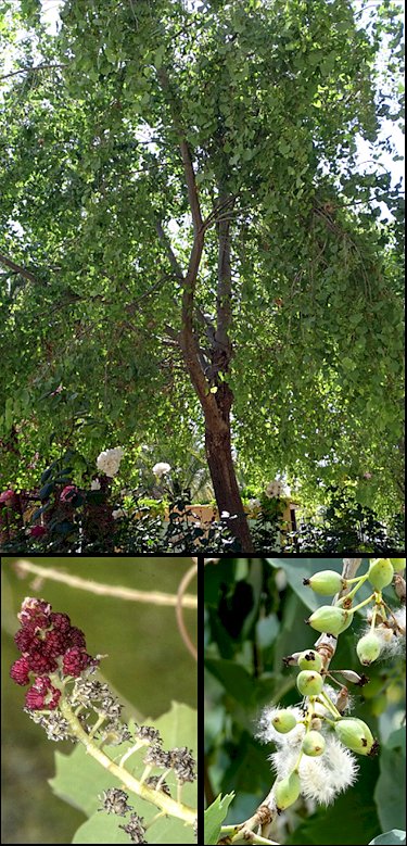 Descripción: Árbol caducifolio, dioico, de 10-15(-20) m de altura, con una copa irregular, a menudo globosa, y un tronco grueso, recto o tortuoso, liso y grisáceo al principio, agrietándose profundamente con el paso de los años, especialmente en la parte inferior. Ramillas inicialmente pubérulas, pero pronto glabras, de color pardo-amarillento. Yemas con 2 escamas, elipsoides, marrón-grisáceas, glabrescentes, de 7-10 mm de largo. Hojas alternas, muy variables en forma y tamaño, las de las plantas jóvenes y brotes largos son de lineares a lanceoladas, de 3-12 x 1-4 cm, generalmente enteras, a veces con algún diente en la mitad superior, con un pecíolo de 7-15 mm de largo, y las de los árboles adultos y brotes cortos son ovado-rómbicas, elíptico-orbiculares o reniformes, de 2-5 x 3-7 cm o aún mayores, con la base cuneada, redondeada o truncada y el ápice ligera y toscamente dentado, con un pecíolo de 12-50 mm de largo, achatado en su extremo. Tienen una textura algo coriácea, y son glabras y de color verde glauco. Nervadura más destacada por el envés, con 3-5 nervios basales y el nervio medio penninervadas. No es raro ver coexistiendo hojs de varios tipos en la misma ramilla. Inflorescencias en amentos colgantes, densos, los masculinos de 2,5-5 cm de largo, con flores sobre pedicelos de 2-4 mm de largo, con 12-14 estambres con las anteras oblongas, purpúreas, más largas que los filamentos. Amentos femeninos de 2,5 cm de longitud, alargándose notablemente en la fructificación, con flores tubulares, con 8-12 segmentos lineares, sobre pedicelos de 8-12 mm de largo, con un ovario ovoide, con un estilo corto rematado por 3 estigmas grandes, purpúreos, bilobados. Frutos en cápsulas ovado-lanceoladas de 8-12 mm de longitud, sobre pedicelos de 3,5-5 mm, lisas, coriáceas, glaucas, abriéndose en 2-3 valvas, conteniendo numerosas semillas con pelos blanquecinos. Cultivo y usos: Árbol que tolera muy bien la sequía y la salinidad, siendo por ello utilizado en lugares difíciles donde no podrían prosperar otros árboles. Su madera es rojiza, dura y de mediana densidad, utilizándose localmente como combustible y en la fabricación de artículos deportivos, juguetes, instrumentos musicales, tornería, etc. Las hojas sirven de alimento al ganado caprino. Su corteza tiene aplicaciones medicinales. Siendo un árbol que produce muchos chupones de raíz, en cambio no es fácil su reproducción vegetativa. Tiene un crecimiento bastante lento. |