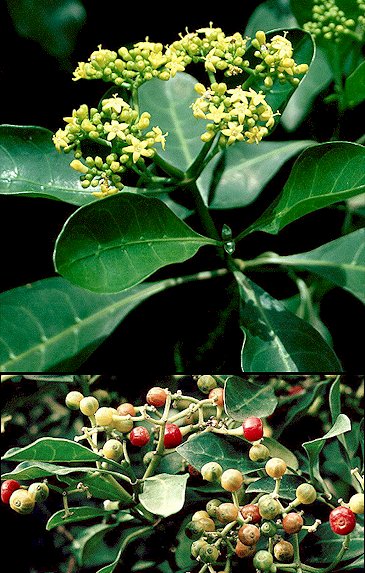 Descripción: Arbusto o arbolito siempreverde de 2-4 m de altura en cultivo, con la corteza de color gris castaño y las ramas redondeadas o finamente acostilladas, verdosas, glabras. Hojas opuestas, de estrechamente obovadas a oblanceoladas u oblongo-elípticas, de 3-20 x 1-10 cm, con la base estrechamente cuneada, el margen entero y algo ondulado y el ápice redondeado o acuminado. Tienen textura más o menos coriácea, y son de color verde intenso lustroso en el haz y más pálidas en el envés, glabras (existe una variedad con pelos), con 4-6 pares de nervios laterales algo marcados y pálidos, a menudo con domacios (bultitos) en las axilas; pecíolo de 5-20 mm de largo; estípulas de triangulares a ovado-triangulares, de 3-8 mm de longitud, agudas, glabras, pronto caducas. Inflorescencias corimbosas, terminales, muy ramificadas, de hasta 15 cm de largo, sobre pedúnculos glabros de hasta 10 cm de longitud, con un par de brácteas oblanceoladas. Flores sobre pedicelos de 2-12 mm de largo; cáliz urceolado, con 5 dientes cortos, triangulares, con el margen ciliolado; corola gamopétala, amarillenta, con el tubo cilíndrico, de 3-5 mm de largo y el limbo con 5 lóbulos oblongo-triangulares, de hasta 3 mm de largo. Estambres 5, subexertos, con anteras oblongas. Estilo exerto; estigma bífido. Frutos en bayas globosas que contienen 2 semillas, rojizos en la madurez, de 5-6 mm de diámetro. Cultivo y usos: Se multiplica por semillas. Especie poco conocida en España pero muy ornamental, siendo llamativa cuando está en floración o cuando se cubre de frutos rojizos, lo que ocurre por un período largo de tiempo. Requiere climas templados, suelos medios y riegos en verano. Planta medicinal con usos gástricos. Su madera es dura, siendo utilizada en la fabricación de utensilios. |