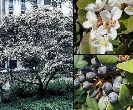 Descripción: Arbusto siempreverde, redondeado, de 1-2 m de altura, con hojas coriáceas, ovado-oblongas u obovadas, de hasta 9 cm de longitud, con el margen diminutamente crenado o aserrado en la parte superior. Cuando jóvenes están cubiertas de lanosidad que enseguida desaparece. Flores fragantes, de hasta 2 cm de diámetro, blancas, con los estambres de color carmín. Frutos aperados, de color negro azulado, con una semilla. Datos de cultivo: Se multiplica por semillas o por esquejes. Necesita suelos fértiles, con buen drenaje y cierta humedad. Con Raphiolepis indica ha producido el híbrido R. x delacourii. Injertada sobre pie de Cydonia oblonga adquiere el porte de arbolito, muy llamativo en plena floración. |