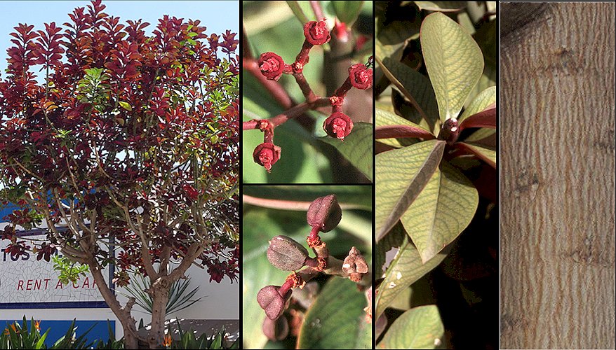 Descripción: Arbolito o arbusto siempreverde, monoico, de 5-7 m de altura, con látex cáustico, muy ramificado y con los tallos cilíndricos, glabros, con cicatrices de las hojas, carnosos de jóvenes tornándose algo leñosos con el tiempo, y un tronco de corteza pardo-grisácea bastante lisa o algo escamosa. Hojas alternas, subsésiles, obovadas, de hasta 18 x 9 cm, con la base atenuada o cuneada, el margen subrevoluto y diminutamente dentado y el ápice abruptamente agudo y recurvado; son de textura algo carnosa, glabras, de color verde brillante, a menudo con tintes purpúreos, o a veces enteramente purpúreas; nervio medio prominente y formando una especie de quilla por el envés, con la nervadura secundaria reticulada. Inflorescencias agrupadas en el ápice de las ramas, formando pseudoumbelas sobre pedúnculos pubescentes de 2-4 cm de largo, con 4 radios bifurcados dos veces, con las ramificaciones pubescentes, de 0,5-2 cm de longitud, acabadas cada una en un involucro sésil; brácteas pubescentes, de unos 3 mm de largo, más o menos dentadas. Ciatios de 2,5 x 7 mm, con un involucro infundibuliforme, pubescente por debajo, rojizo. Anillo glandular más o menos de 1 mm de ancho, entero o más o menos lobado, rojizo; lóbulos 5, subcuadrangulares de 1,5 x 2 mm. Flores sin pétalos ni sépalos, las masculinas reducidas a 5 grupos de estambres de 3,5-3,8 mm de largo, ligeramente exertos, opuestos a los lóbulos del involucro; flores femeninas con estilos de 1,5-1,8 mm, unidos hasta la mitad de su longitud, pubérulos, con los ápice bífidos y engrosados. Fruto en cápsula pubescente, erecta, trilobada, de color rojo oscuro, de hasta 7,5 mm de diámetro, sobre un pedicelo pubescente de 3-4 mm de largo; semillas ovoides, angulosas, de unos 2,8 x 2,5 mm, grisáceas, tuberculadas, con una carúncula rudimentaria. Cultivo y usos: Planta que requiere climas muy suaves, pues se hiela con facilidad si las temperaturas descienden por debajo de -1 ó -2 °C, así como suelos bien drenados, siendo por lo demás muy poco exigente y resistente a la sequía. Se multiplica por esquejes normalmente, pues arraigan fácilmente, debiendo ser almacenados a la sombra a la espera de que seque bien la zona de corte antes de su plantación; también se puede multiplicar por semillas. El látex de la planta es irritante y venenoso, cosa a tener en cuenta. Existe una forma 'Rubra', que tiene los tallos rojizos y las hojas que abren de color vino, tornándose más tarde rojo-bronceadas, con todas las partes de las inflorescencias de color rojo oscuro. Esta especie es la que más se suele ver en cultivo, confundiéndose con Synadenium grantii Hook. f., nativa del este de África tropical y cultivada muy ocasionalmente. |