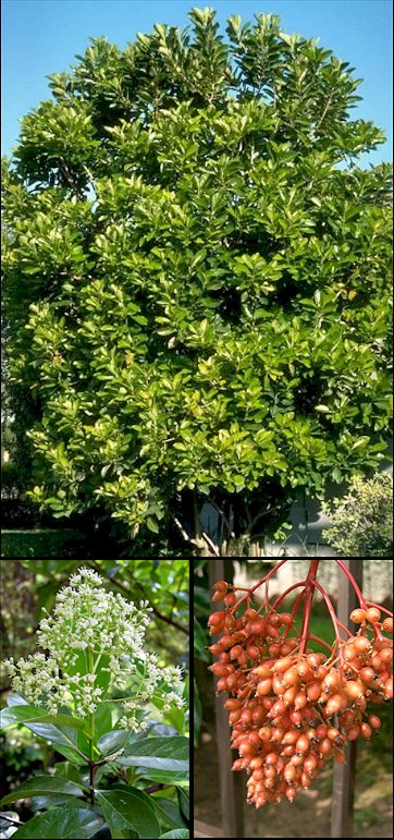 Descripción: Arbusto o arbolito siempreverde bastante denso, que puede alcanzar 5-7 m de altura en cultivo, aunque en sus lugares de origen y en emplazamientos favorables puede llegar a mayores alturas, con la corteza rugosa o verrucosa de color gris-marrón oscuro, las ramillas jóvenes glabras o con algunos pelos estrellados y las del año anterior glabras y con lenticelas. Hojas opuestas, ocasionalmente ternadas en brotes muy vigorosos, de elípticas a oblongas u oblongo-obovadas, en ocasiones suborbiculares, de 7-20 x 3-9 cm, con la base cuneada, más raramente redondeada, sin glándulas a ambos lados del nervio medio, el margen subentero o ligeramente ondulado-crenado hacia el ápice y el ápice obtuso o redondeado, o a veces agudo y mucronado. Son de consistencia coriácea, glabras y de color verde oscuro brillante por el haz, y verde más claras, con pelos en las axilas de los nervios y con diminutos puntos glandulares rojizos por el envés. Nervadura pinnada, ligeramente impresa por el haz y destacada por el envés, con 4-9 pares de nervios laterales arqueados, ramificados, anastomosados cerca del margen. Pecíolo verde o rojizo, robusto, de 10-30 mm de largo, glabro o con pelos estrellados. Estípulas ausentes. Inflorescencias en cimas paniculiformes piramidales, terminales, de 5-20 cm de largo, sobre gruesos pedúnculos de 4-10 cm de longitud. Flores todas bisexuales, regulares, fragantes, sésiles o cortamente pediceladas, de 6-8 mm de diámetro. Cáliz verde, glabro, con el tubo de 1,5-4 mm y 5 lóbulos triangulares, glabros; corola rotácea, blanca, tornándose luego amarillenta, glabra, con un tubo corto y 5 lóbulos reflexos, suborbiculares, de 2-3 mm, redondeados en el ápice. Androceo con 5 estambres exertos, con los filamentos blancos y las anteras oblongas, amarillentas. Drupas ovoide-elípticas, de 7-9 mm de largo, glabras, redondeadas en los extremos, inicialmente de color rojo, tornándose azul-negruzcas en la madurez. Pirenos comprimidos, ovoide-elipsoides, de 6-7 mm de largo, con un surco ventral profundo. Cultivo y usos: Planta que resiste el frío si no es demasiado intenso y duradero, pudiendo perder en parte las hojas. Gusta de suelos bien drenados, algo húmedos, mejor algo ácidos, en exposición soleada y con algo de sombra, en lugares más bien frescos, pues no va bien en lugares demasiado calurosos. Si tolera en cambio la salinidad. Aunque la multiplicación por semillas es posible, pero es lenta y engorrosa, se acude casi siempre a la multiplicación vegetativa por medio de esquejes. También comercialmente se acude a la micropropagación. Arbusto o arbolito interesante por sus fragantes flores, sus frutos y sus hojas verde brillantes. Se utiliza como ejemplar aislado o en setos informales, formando pantallas o barreras, pues admite bien los recortes. |