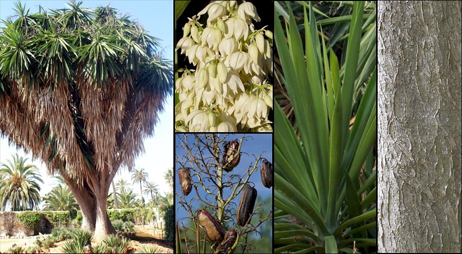 Descripción: Planta arborescente de 3-10 m de altura, normalmente con varios troncos leñosos, delgados y ramificados en la parte superior, acabados en una roseta de hojas, cada uno de los cuales nace de una base ancha y engrosada, con proyecciones a la manera de contrafuertes en los ejemplares viejos, y con una corteza que con el paso del tiempo se torna gruesa y corchosa, rugosa y grisácea; ramas cilíndricas y quebradizas, desnudas en la parte inferior y con hojas en la parte superior, que una vez secas permanecen colgando por 2-3 años antes de caer, dejando cicatrices foliares anchas y arqueadas. Hojas en espiral, formando rosetas terminales, más o menos horizontales y las inferiores colgantes, linear-lanceoladas, de 60-140 x 5-7(-10) cm, coriáceas, más o menos rígidas, lisas por el haz y a veces rugosas por el envés, de color verde oscuro brillante, o matizadas con otros colores en algunos cultivares, planas o un poco cóncavo-convexas, con los márgenes hialinos, lisos o rugosos y diminutamente denticulados, amarillos o rojizos, sin filamentos, estrechándose en la base y con el ápice largamente acuminado y acabado en una punta suave, verde, de 5-10 mm de largo. Inflorescencias en panículas terminales erectas, densas, de 50-80(-100) cm de largo, con numerosas flores colgantes, acampanadas o globosas, carnosas, con los tépalos ovado-oblongos, acuminados, curvados hacia adentro, blancos o cremosos, de 3-5 x 1,5-2 cm, los externos algo más anchos que los internos. Estambres con los filamentos insertos en la base del ovario, de 8-10 mm de longitud; ovario sésil, oblongo, de 2 x 1 cm; estilo muy corto, recurvado, papiloso, coronado por 3 lóbulos estigmáticos bífidos. Fruto indehiscente, bacciforme, carnoso, oblongo-ovoide, de 7-8 x 4,5 cm. Semillas redondeadas, sin alas, de 8-10 mm de diámetro. Cultivo y usos: