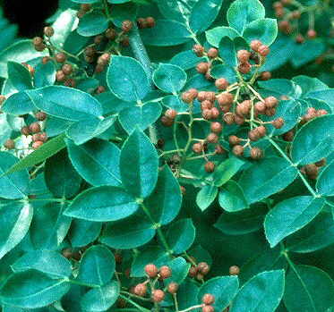 Descripción: Arbusto o arbolillo caducifolio de 4-6 m de altura como máximo, de tallos espinosos y ramillas de color marrón. Hojas alternas, paripinnadas, con 3-11 folíolos ovados, opuestos, de 3,7-6,5 cm de longitud, con el ápice agudo, de color verde fuerte en el haz y más claro en el envés; cuando jóvenes pubescentes en el envés. Margen diminutamente dentado o entero. Pecíolo diminuto, casi sésiles. Flores verdosas dispuestas en cimas axilares sésiles que nacen después que las hojas. Carecen de cáliz y tienen 4-5 pétalos. Fruto en folículo rojizo que se torna negruzco, fragante, elipsoide, de unos 5 mm de diámetro. Semillas negras, brillantes. Cultivo y usos: Se multiplica por semillas o por esquejes. Requiere suelos fértiles y húmedos y exposición soleada o a media sombra. Tolera bastante el frío. Su corteza y los frutos tienen aplicaciones medicinales como purgantes y para aliviar dolores de muelas. |